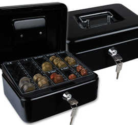 CAISSE MONNAIE Q-CONNECT STRUC TURE ACIER 0.8MM APAISSEUR PLATEAU AMOVIBLE ESPACE BILLETS 152X80X115MM COLORIS NOIR