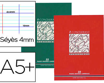 CAHIER CONQUÉRANT CLASSIQUE PIQÛRE ÉCRITURE COUVERTURE VERNIS CARTE COUCHÉE 170X220MM 32F 90G SÉYÈS 4MM 2 COLORIS A5+