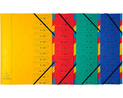 TRIEUR EXACOMPTA CARTE LUSTRÉE 240X320MM 5/10E DOS AGRAFÉ 12 POSITIONS REPÈRES IMPRIMÉS 4 COLORIS ASSORTIS